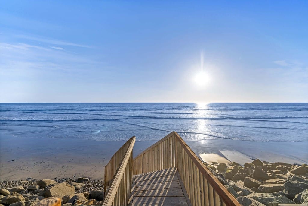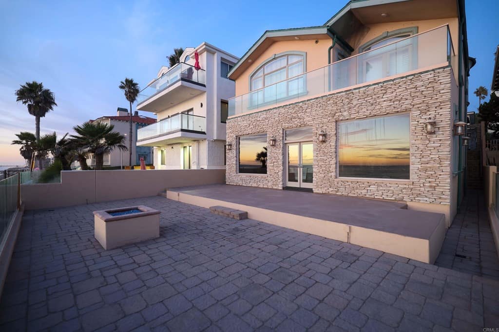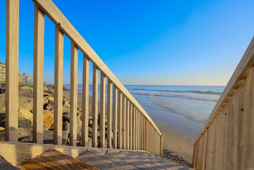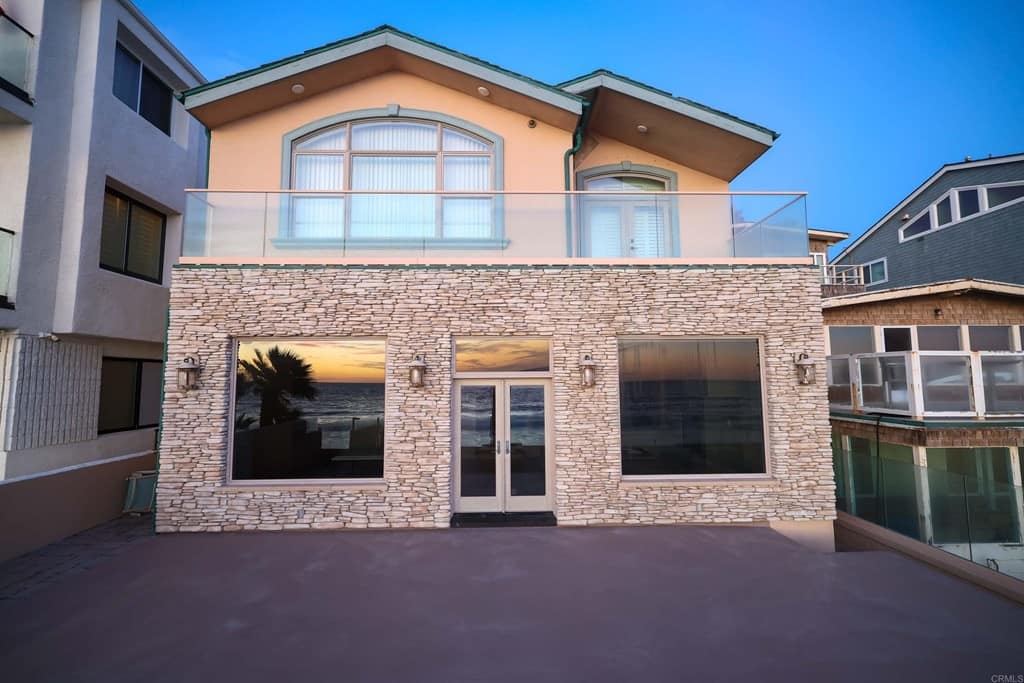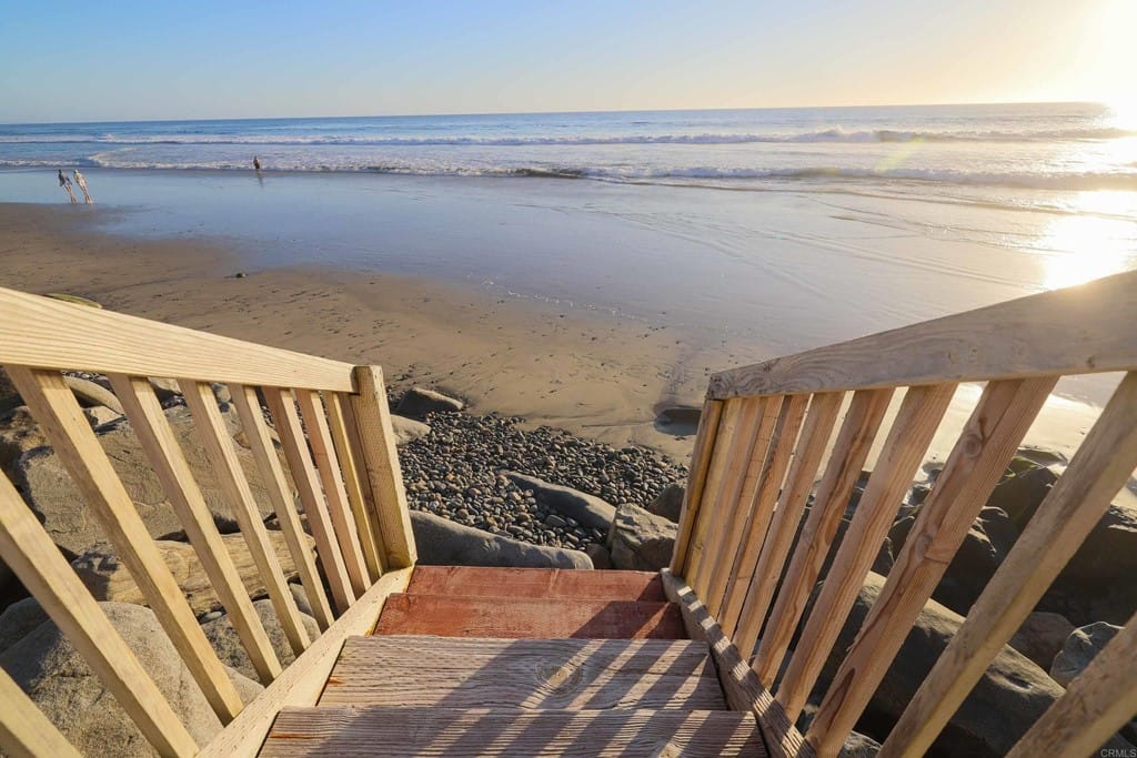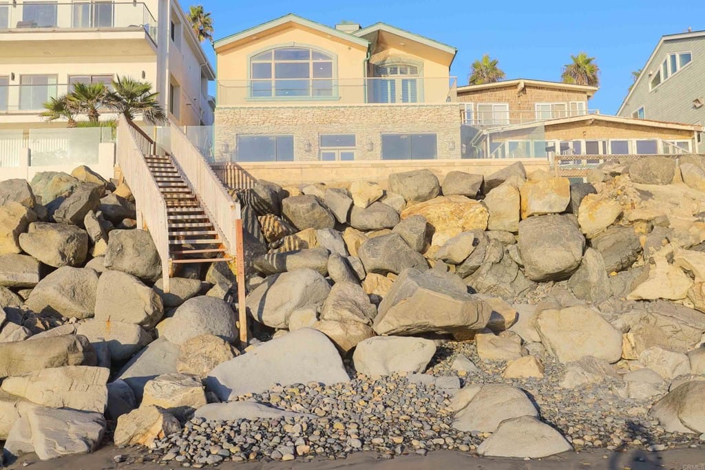 OWNER WILL CARRY FIRST LOAN …Custom-built beach home located steps away from the shore with stunning white water panoramic views and a beautiful deck including a private staircase leading down to the sand. The grandfathered in stairs are a unique opportunity as this is one of the few homes on the coast with one, and newer properties along the coast seldomly can get approval to build them. The entry greets you with a classical chandelier hanging two stories high with custom down-lighting and a massive grand entryway. The chef’s kitchen is complete with stainless steel appliances range oven, and insane ocean blue views of the horizon from every angle. The living room features a wood-burning gas fireplace and seashell inserts within the granite. The french doors open out to the extra-large patio that is perfect for watching the sunset, entertaining guests, and even walking down to the beach! The Master bedroom and second master bedroom share a balcony with views that gaze over to the harbor and go as far as La Jolla shores. The lower level features a large game/media room with private access and a side door to the backyard. Join us next weekend for an exclusive sunset showing experience. DO NOT miss your chance at this custom-built coastal rock dream home steps away from the shore.
