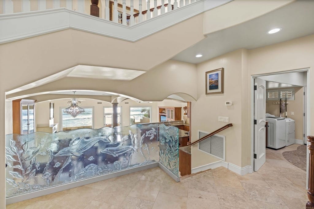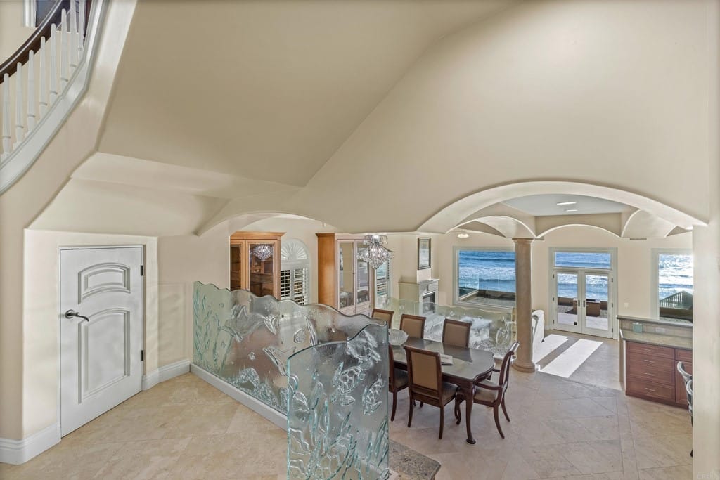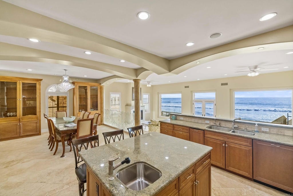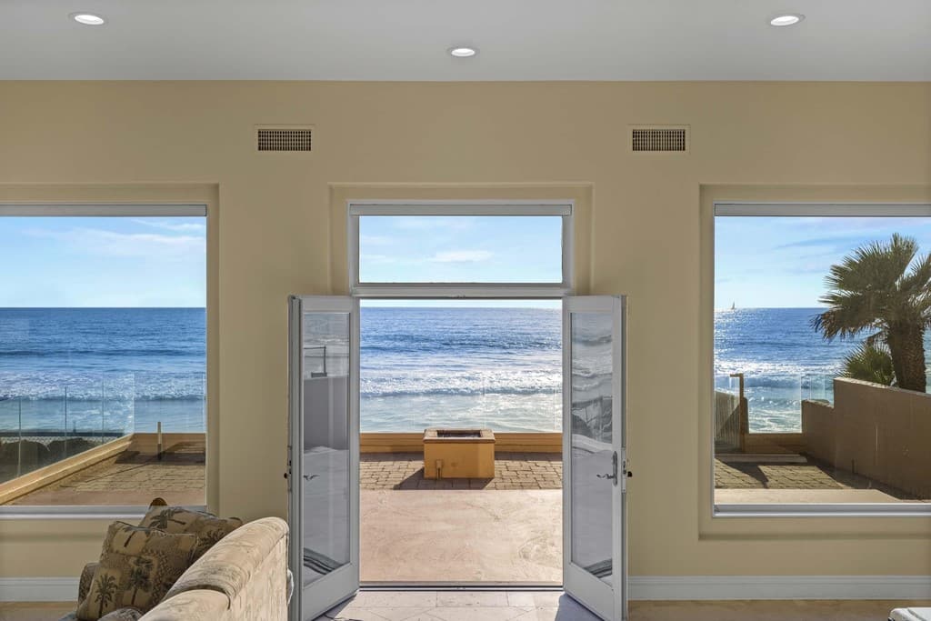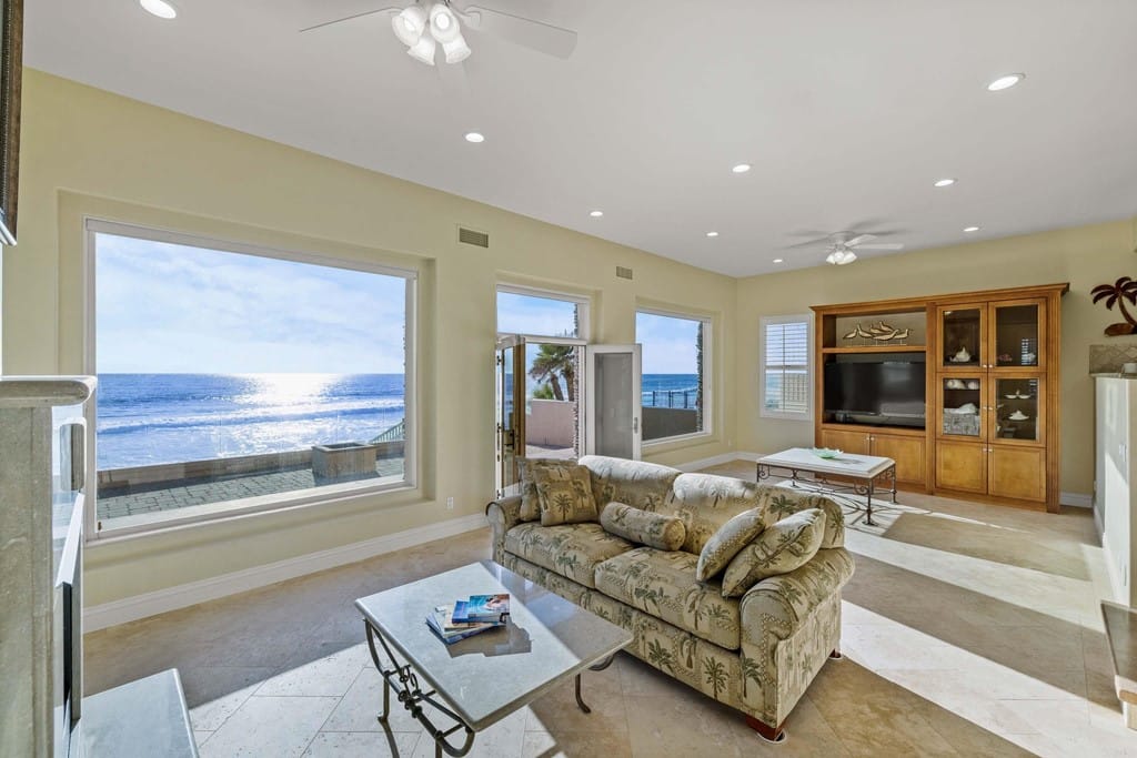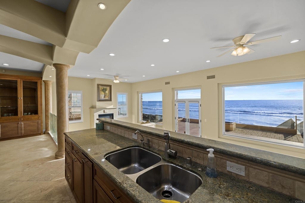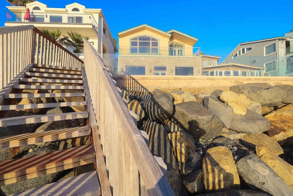 OWNER WILL CARRY FIRST LOAN …Custom-built beach home located steps away from the shore with stunning white water panoramic views and a beautiful deck including a private staircase leading down to the sand. The grandfathered in stairs are a unique opportunity as this is one of the few homes on the coast with one, and newer properties along the coast seldomly can get approval to build them. The entry greets you with a classical chandelier hanging two stories high with custom down-lighting and a massive grand entryway. The chef’s kitchen is complete with stainless steel appliances range oven, and insane ocean blue views of the horizon from every angle. The living room features a wood-burning gas fireplace and seashell inserts within the granite. The french doors open out to the extra-large patio that is perfect for watching the sunset, entertaining guests, and even walking down to the beach! The Master bedroom and second master bedroom share a balcony with views that gaze over to the harbor and go as far as La Jolla shores. The lower level features a large game/media room with private access and a side door to the backyard. Join us next weekend for an exclusive sunset showing experience. DO NOT miss your chance at this custom-built coastal rock dream home steps away from the shore.